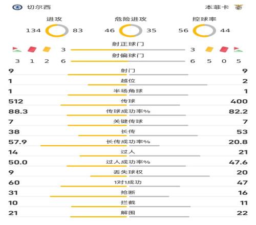 在過人方面,則反倒是本菲卡以21-14領先;過人成功率方面,則是切爾西以50%-47.6%稍稍領先。