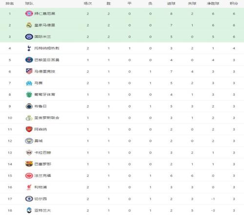 隨著皇馬50,拜仁51,歐冠最新積分榜:利物浦01輸球跌至第16