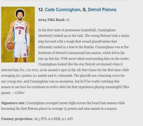 在賽季開賽前美國ESPN評選的NBA百大球星中,坎寧安位列第12位,而在2024-25賽季開賽時他的排位是67位,經過一個賽季打拼,他取得飛速進步,網站評語如下:坎寧安首次體驗季后賽,就展現出了不俗實力,年輕的活塞隊在季后賽首輪與尼克斯隊展開了激烈較量,最終惜敗,但他們仍然取得了長足進步.坎寧安是底特律復興的關鍵人物,這也讓他在這份榜單上名列前茅。隨著球隊陣容中更多優秀球員加入,坎寧安展現出了底特律在2021年選秀大會上用狀元簽選中他時所期待的明星風采.他首次入選全明星賽,場均貢獻26.1分、9.1次助攻、6.1個籃板。季后賽對于任何一位年輕球星來說都是一次寶貴的學習機會,坎寧安也不例外.本賽季,他的表現值得關注,我們將拭目以待,看看他在首次征戰NBA季后賽后將如何成長.