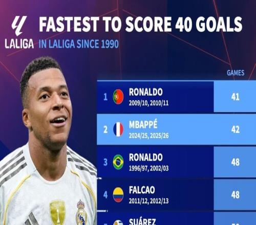北京時間10月8日,來自德轉的統計指出,姆巴佩成為了自1990年以來,在西甲聯賽達成40球大關所用場次第二少的球員,僅次于C羅。在上周末西甲第8輪的比賽中,皇馬主場3-1擊敗了比利亞雷